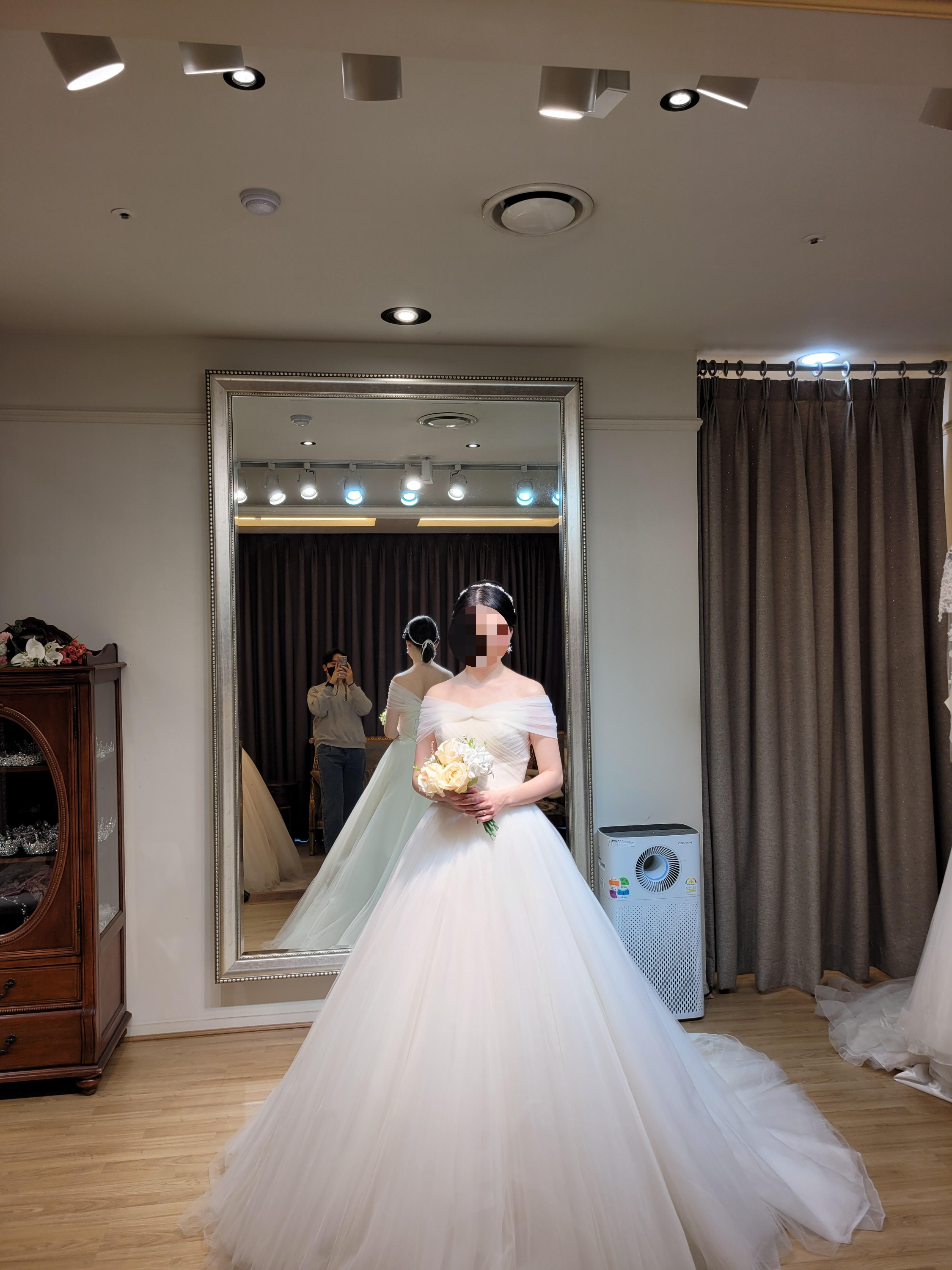 네 번째 피팅했던 웨딩드레스예요. 이건 입자마자 '백설공주 같아요. 무도회 가서 춤춰야 될 것 같아요.'라면서 감탄을 내뱉었던 드레스에요. 하지만, 제가 봤을 때의 모습과 예비신랑이 보고 사진 찍어준 걸 봤을 때는 밋밋하고 부 해 보이는 것 같아서 패스했습니다.. 예비신랑이 보고서는 이거보다는.. 전에 거가 난 것 같아.라고 솔직하게 말해줘서 웨딩드레스 선택하는데 크게 고민 없이 패스하게 되었습니다.