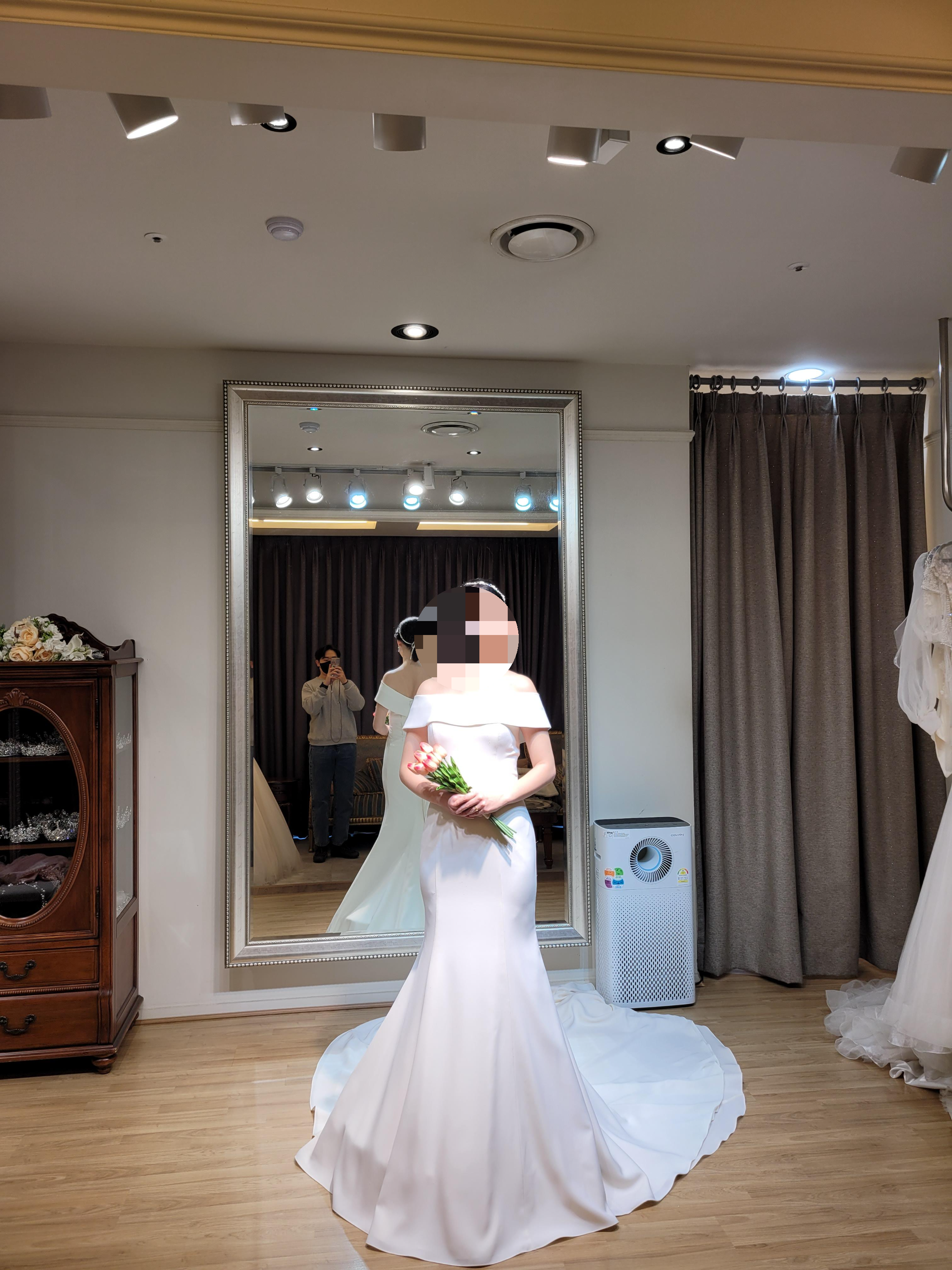 이렇게 몸에 쫙 달라붙는 몸의 라인이 드러나는 웨딩드레스는 피하고 싶었는데, 막상 입어보니깐... 생각보다 괜찮게 느껴졌어요.